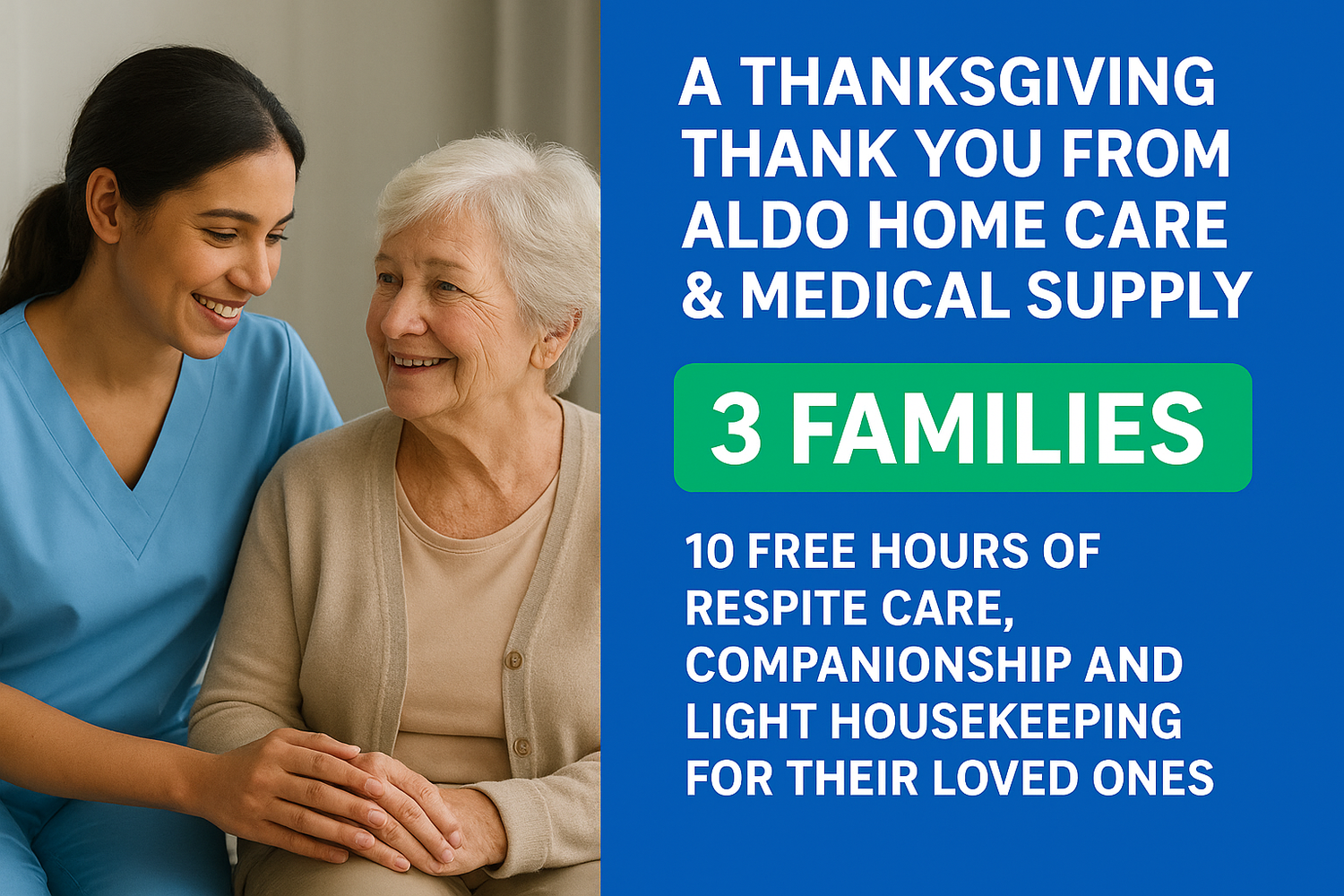 At Aldo Home Care & Medical Supply, we’re truly grateful for the community that has welcomed and supported us. As our way of saying thank you, we’re giving back by offering three local families the opportunity to receive 10 hours of free in-home care services — completely free of charge, with no contracts or obligations.