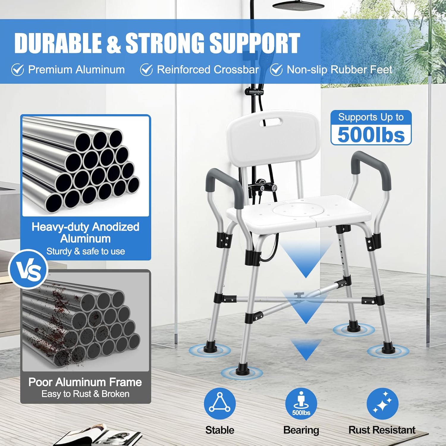 500 lbs Extra-Wide Adjustable Shower Chair with Padded Armrests & Back, Anti-Slip Crossbar Seat for Adults, Elderly, Disabled