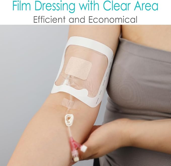 - EASY APPLICATION - At 4.75" x 4", these showerproof wound bandage tape is quite large; this measurement includes the adhesive border. The clear inner window measures 3 5/8" x 2 7/8", allowing you to see your skin, over which the dressing is covering. There is a tab for an IV or catheter line plus space for name and date if needed. Because it is see-through, you can look at the skin around the line, and if there's too much oozing of liquid, or for some reason gets dirty, you can change it.