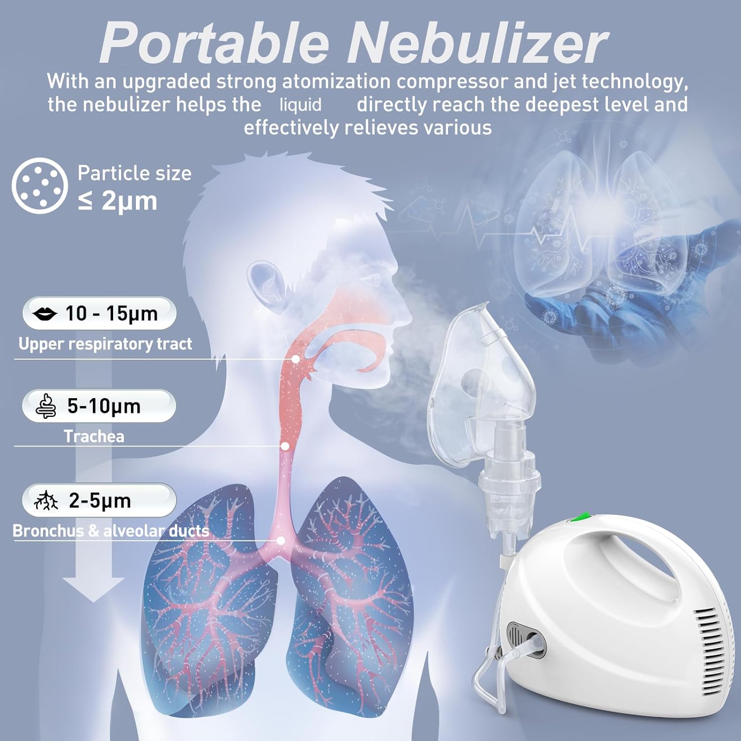 - Portable Nebulizer Machine: Adopting micron-level atomization technology, the nebulizer can make a stable mist and does not choke. Easier to absorb, effectively improving the utilization rate of the liquid and reduce the liquid residue.
